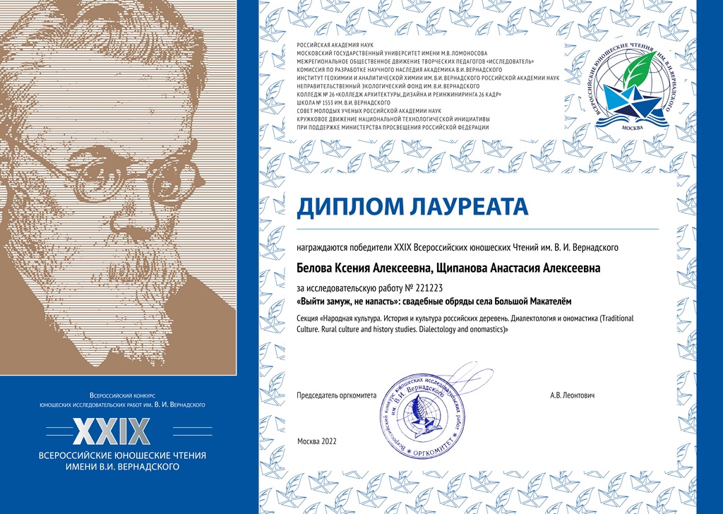 Обучающиеся нашей школы, Щипанова Анастасия и Белова Ксения, приняли участие во втором, заключительном туре XXIX Всероссийского конкурса юношеских исследовательских работ им. В.И.Вернадского в номинации «Народная культура. История и культура русских деревень».